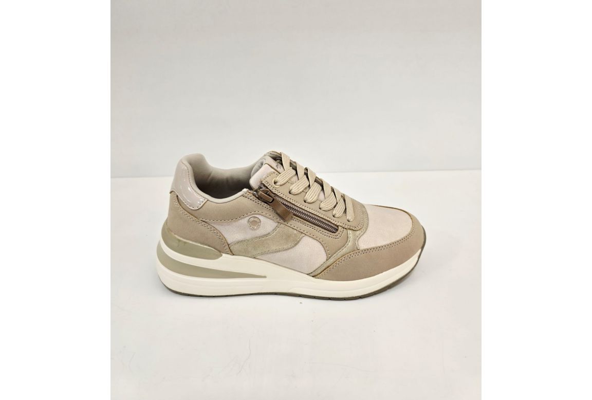 Die Damen-Turnschuhe aus technischem Gewebe mit Kunstledereinsätzen BEIGE bieten dank ihrer Leichtigkeit und der gepolsterten Sohle höchsten Komfort. Dank ihrer Struktur, die sich perfekt an den Fuß anpasst, können Sie sie den ganzen Tag lang tragen, ohne zu ermüden. Ideal für lange Spaziergänge in der Stadt oder für einen Tag beim Einkaufen, ohne dabei auf Stil zu verzichten.