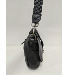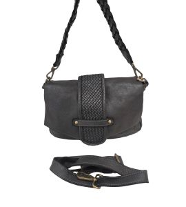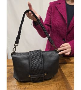 Sac à bandoulière en cuir lavé avec rabat et insert tissé va main- NOIR