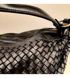 Sac en cuir lavé avec un côté tissé à la main. Fabriqué en Italie - NOIR